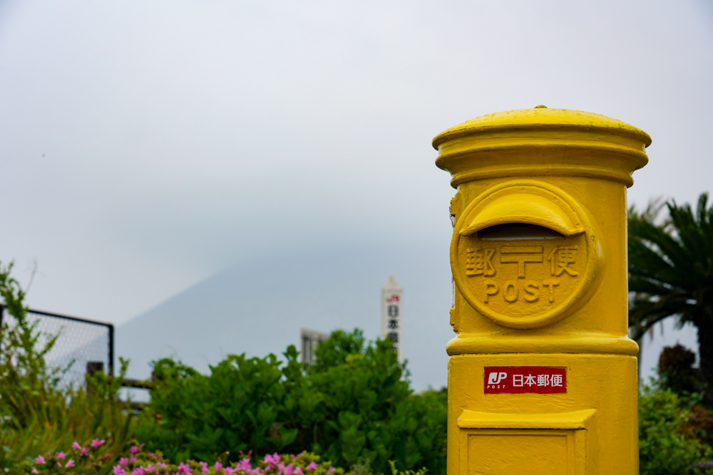 残念ながら開聞岳はけむって見えませんが、黄色いポストが特徴的でみなさん記念撮影してましたよ。