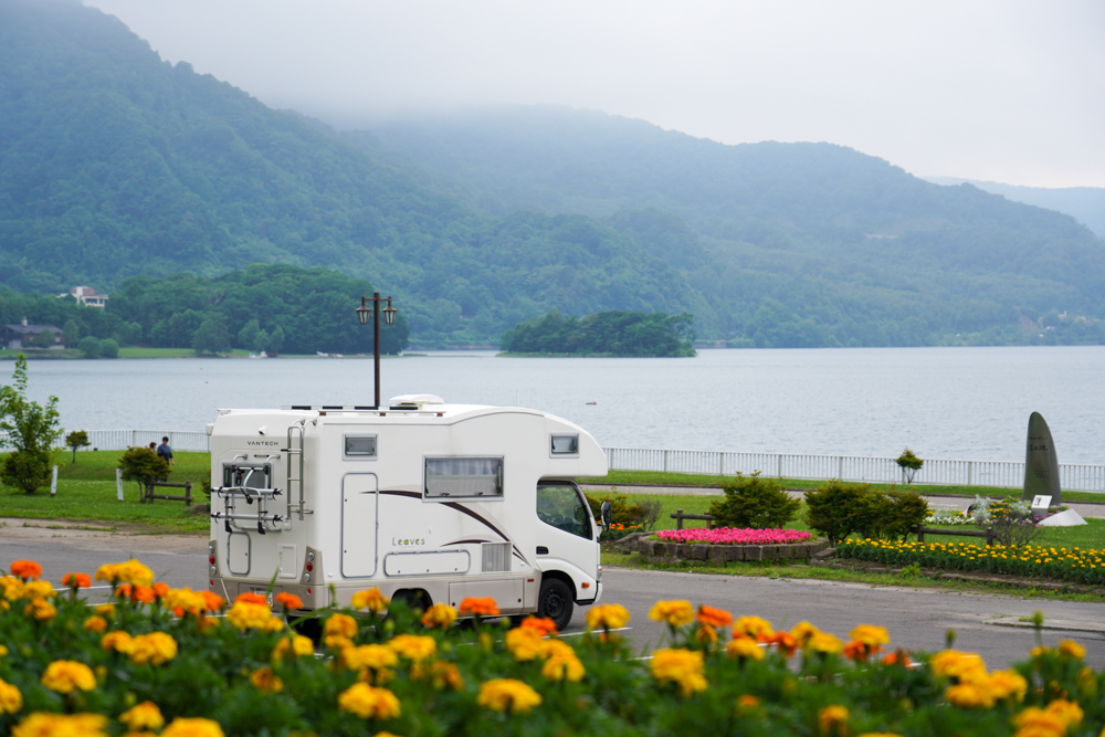 今回のキャラバンはメインの一つとして「ニセコ・洞爺湖」周辺を考えていたんですが残念ながら天候がいまひとつ。せっかくの湖も太陽の光がないと少し残念な感じになりますね。